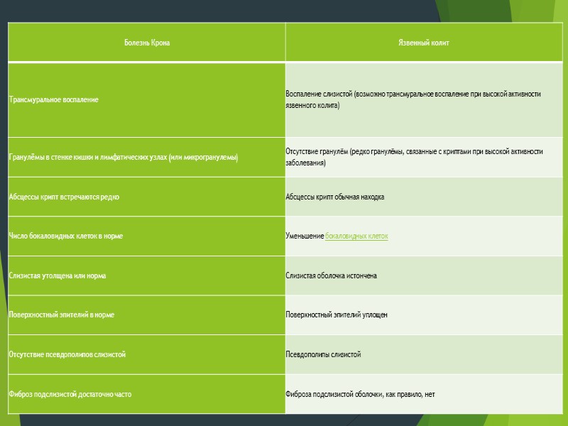 НЯК НЯК неспецифическое иммунное воспаление в пределах слизистой оболочки толстой кишки; Поражение только толстой кишки ( исключая случаи ретроградного илеита); Обязательное вовлечение в процесс прямой кишки; Диффузный характер воспаления Болезнь Крона Неспецифическое гранулематозное трансмуральное воспаление; Поражение любой зоны ЖКТ; Регионарный характер воспаления;
