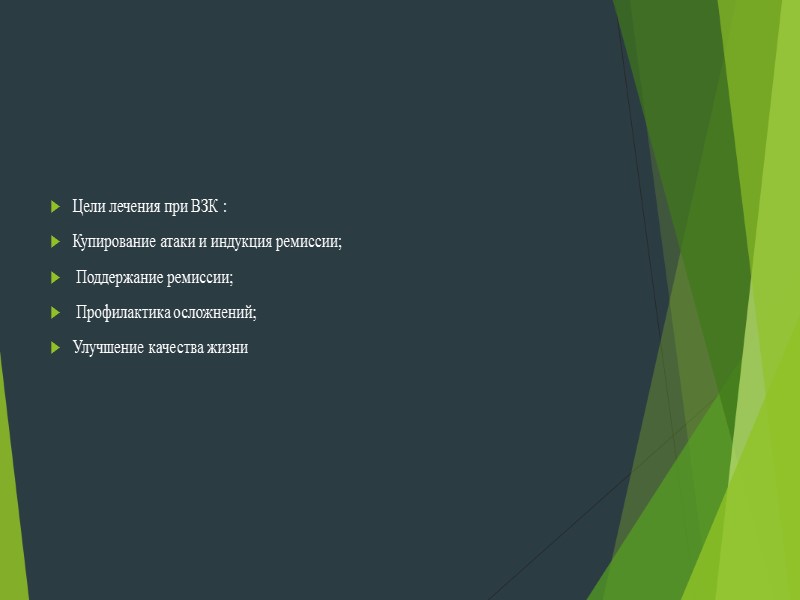Цели лечения при ВЗК : Купирование атаки и индукция ремиссии; Поддержание ремиссии; Профилактика осложнений; Улучшение качества жизни