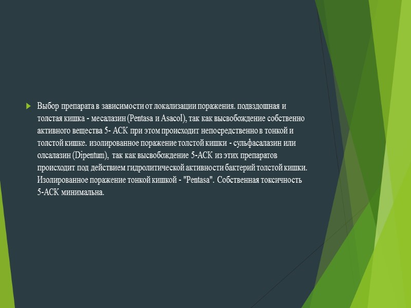 Выбор препарата в зависимости от локализации поражения. подвздошная и толстая кишка - месалазин (Pentasa и Asacol), так как высвобождение собственно активного вещества 5- АСК при этом происходит непосредственно в тонкой и толстой кишке. изолированное поражение толстой кишки - сульфасалазин или олсалазин (Dipentum), так как высвобождение 5-АСК из этих препаратов происходит под действием гидролитической активности бактерий толстой кишки. Изолированное поражение тонкой кишкой - "Pentasa". Собственная токсичность 5-АСК минимальна.