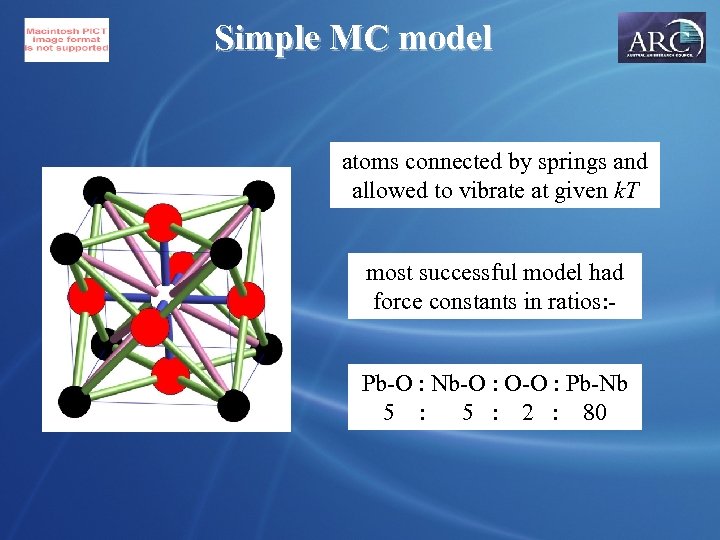 Simple MC model atoms connected by springs and allowed to vibrate at given k. T most successful model had force constants in ratios: Pb-O : Nb-O : O-O : Pb-Nb 5 : 2 : 80