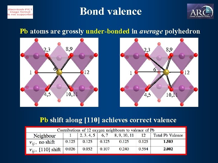 Bond valence Pb atoms are grossly under-bonded in average polyhedron 8, 9 2, 3 6 1 4, 5 12 10, 11 Pb shift along [110] achieves correct valence
