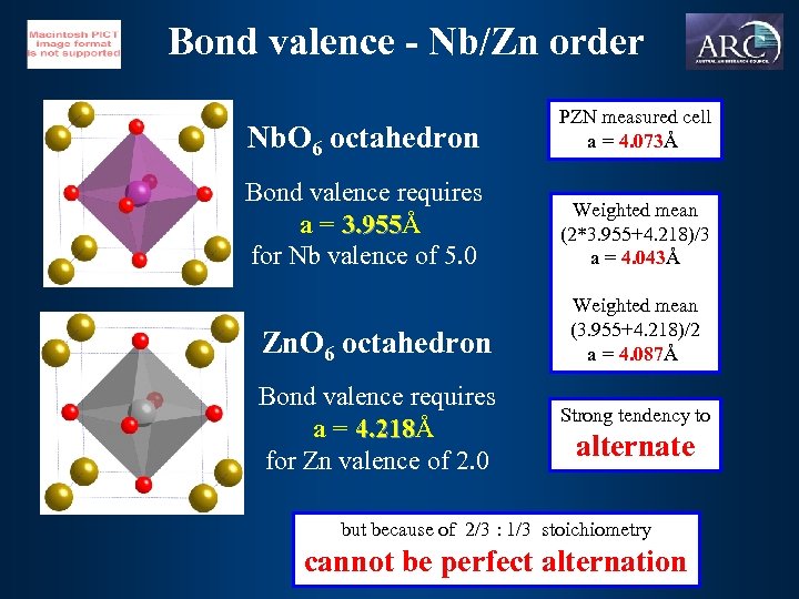 Bond valence - Nb/Zn order Nb. O 6 octahedron PZN measured cell a = 4. 073Å 4. 073 Bond valence requires a = 3. 955Å 3. 955 for Nb valence of 5. 0 Weighted mean (2*3. 955+4. 218)/3 a = 4. 043Å 4. 043 Zn. O 6 octahedron Bond valence requires a = 4. 218Å 4. 218 for Zn valence of 2. 0 Weighted mean (3. 955+4. 218)/2 a = 4. 087Å 4. 087 Strong tendency to alternate but because of 2/3 : 1/3 stoichiometry cannot be perfect alternation