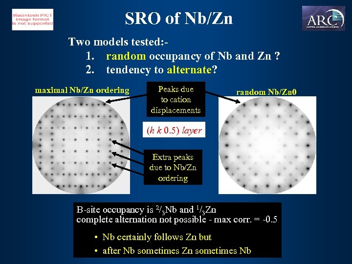 SRO of Nb/Zn Two models tested: 1. random occupancy of Nb and Zn ? 2. tendency to alternate? maximal Nb/Zn ordering Peaks due to cation displacements random Nb/Zn 0 (h k 0. 5) layer Extra peaks due to Nb/Zn ordering B-site occupancy is 2/3 Nb and 1/3 Zn complete alternation not possible - max corr. = -0. 5 • Nb certainly follows Zn but • after Nb sometimes Zn sometimes Nb