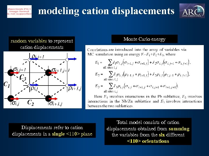 modeling cation displacements random variables to represent cation displacements Displacements refer to cation displacements in a single <110> plane Monte Carlo energy Total model consists of cation displacements obtained from summing the variables from the six different <110> orientations