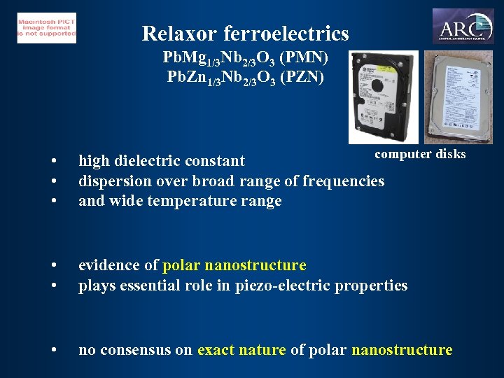 Relaxor ferroelectrics Pb. Mg 1/3 Nb 2/3 O 3 (PMN) Pb. Zn 1/3 Nb 2/3 O 3 (PZN) • • • computer disks high dielectric constant dispersion over broad range of frequencies and wide temperature range • • evidence of polar nanostructure plays essential role in piezo-electric properties • no consensus on exact nature of polar nanostructure