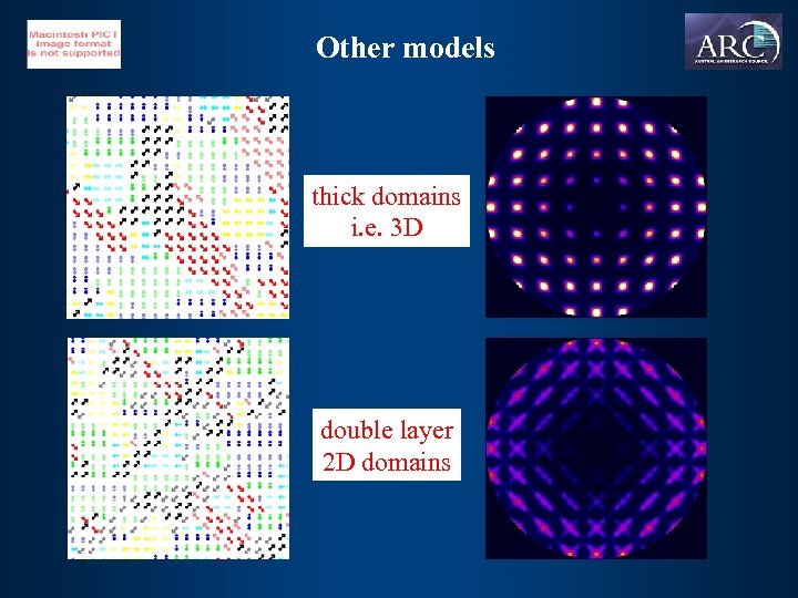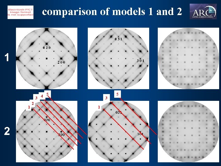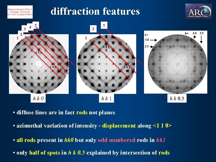 diffraction features 5 3 4 1 2 3 5 1 hk 0 hk 1 h k 0. 5 • diffuse lines are in fact rods not planes • azimuthal variation of intensity - displacement along <1 1 0> • all rods present in hk 0 but only odd numbered rods in hk 1 • only half of spots in h k 0. 5 explained by intersection of rods