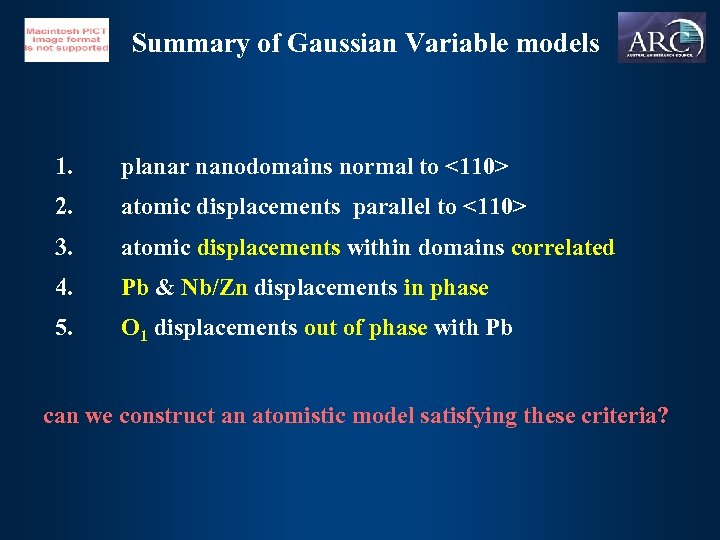 Summary of Gaussian Variable models 1. planar nanodomains normal to <110> 2. atomic displacements parallel to <110> 3. atomic displacements within domains correlated 4. Pb & Nb/Zn displacements in phase 5. O 1 displacements out of phase with Pb can we construct an atomistic model satisfying these criteria?