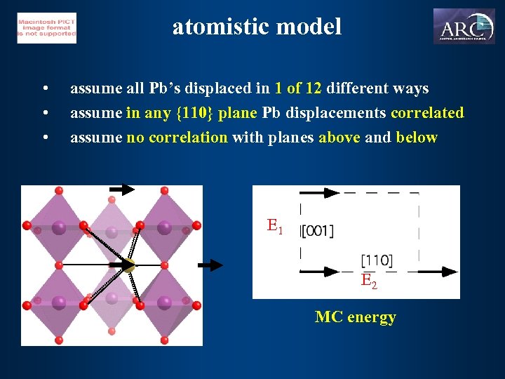 atomistic model • • • assume all Pb’s displaced in 1 of 12 different ways assume in any {110} plane Pb displacements correlated assume no correlation with planes above and below E 1 E 2 MC energy
