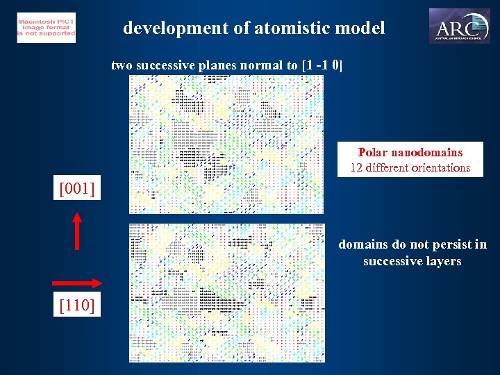 development of atomistic model two successive planes normal to [1 -1 0] Polar nanodomains 12 different orientations [001] domains do not persist in successive layers [110]