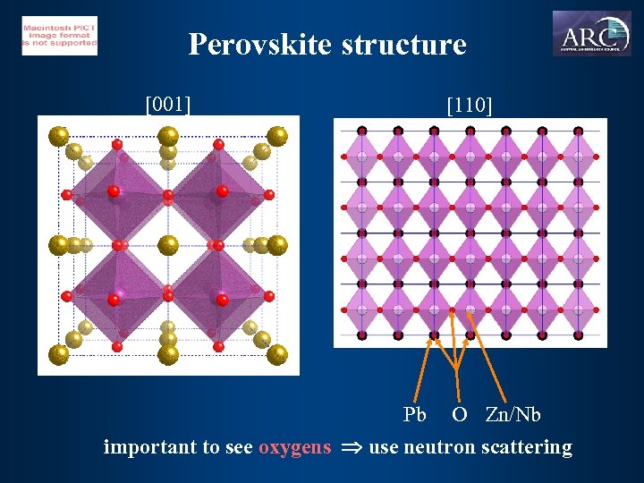 Perovskite structure [001] [110] Pb O Zn/Nb important to see oxygens use neutron scattering