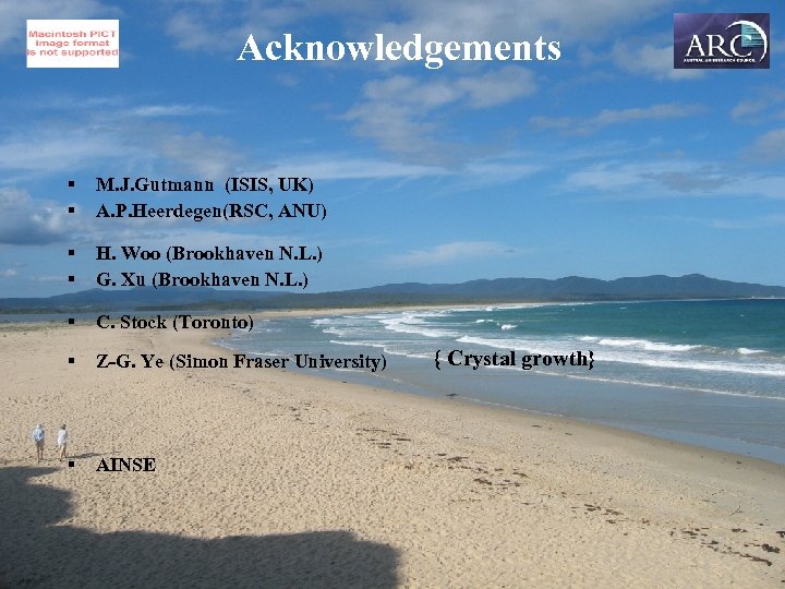 Acknowledgements § § M. J. Gutmann (ISIS, UK) A. P. Heerdegen(RSC, ANU) § § H. Woo (Brookhaven N. L. ) G. Xu (Brookhaven N. L. ) § C. Stock (Toronto) § Z-G. Ye (Simon Fraser University) § AINSE { Crystal growth}