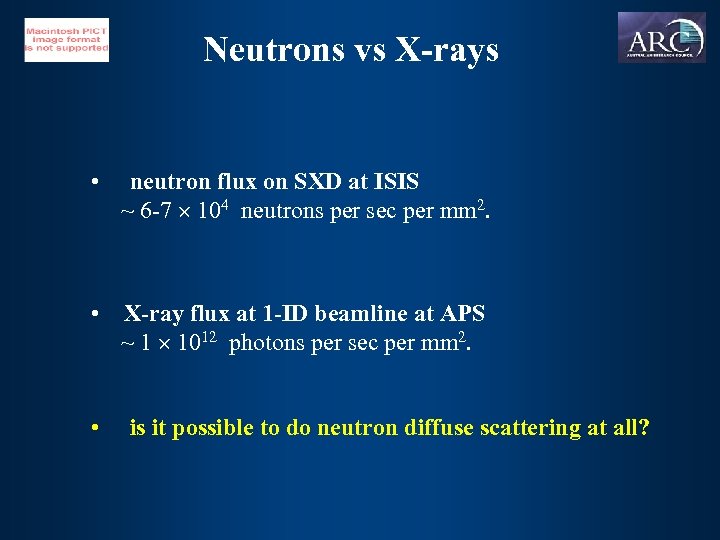 Neutrons vs X-rays • neutron flux on SXD at ISIS ~ 6 -7 104 neutrons per sec per mm 2. • X-ray flux at 1 -ID beamline at APS ~ 1 1012 photons per sec per mm 2. • is it possible to do neutron diffuse scattering at all?