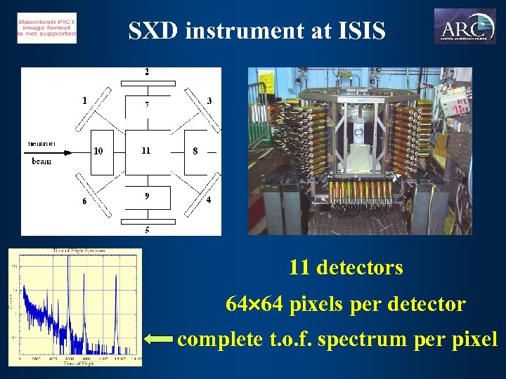 SXD instrument at ISIS 11 detectors 64 64 pixels per detector complete t. o. f. spectrum per pixel