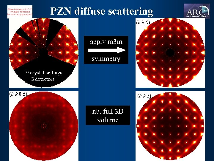 PZN diffuse scattering (h k 0) apply m 3 m symmetry 10 crystal settings 8 detectors (h k 0. 5) (h k 1) nb. full 3 D volume