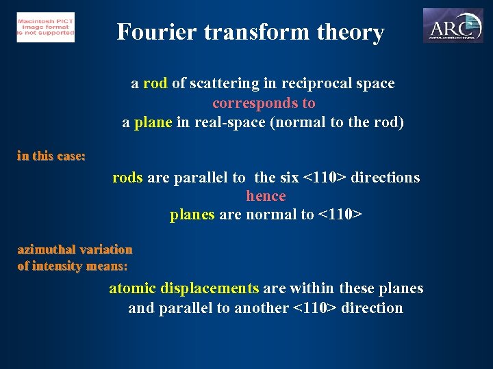 Fourier transform theory a rod of scattering in reciprocal space corresponds to a plane in real-space (normal to the rod) in this case: rods are parallel to the six <110> directions hence planes are normal to <110> azimuthal variation of intensity means: atomic displacements are within these planes and parallel to another <110> direction