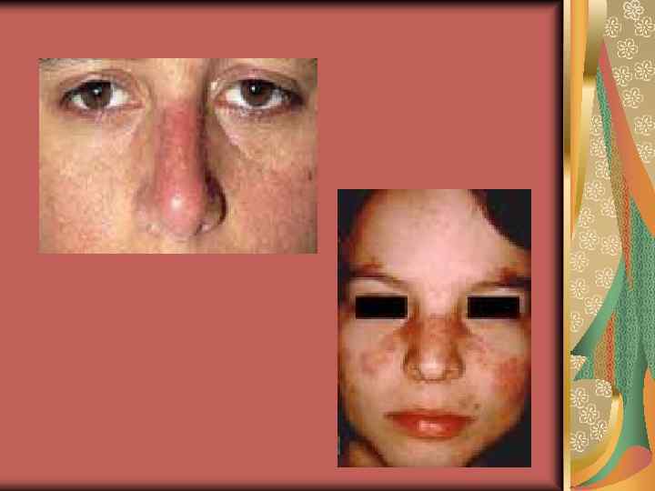 Поражение кожи при СКВ Наблюдается у 85 -90% больных. Проявляется эритемой с отеком, инфильтрацией, гиперкератозом со склонностью к образованию некрозов с последующими пигментацией и рубцеванием. Патогномонична “бабочка” на лице в области переносья и щек. Нередко люпус-хейлит, разнообразные изменения на слизистых. Часты трофические нарушения: общая сухость кожи, диффузное выпадение волос, деформация и ломкость ногтей. Характерна локализация кожных изменений преимущественно на открытых участках тела.