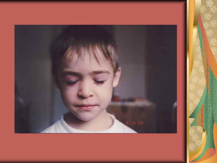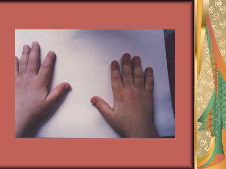 Телеангиэктазии в области верхних век; «сосудистый венчик» на ладонях, кончиках пальцев. Акроцианоз, гипергидроз, похолодание конечностей. Поражение слизистых оболочек полости рта, верхних дыхательных путей, конъюнктивы, у девочек - влагалища. Характерны отечность и эритема красной каймы губ, иногда ее сухость, наличие корочек, чешуек, трещин. Наблюдается диффузная гиперемия твердого и мягкого неба, отечность слизистых оболочек щек.