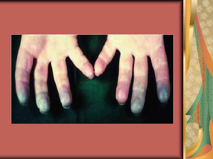 Наиболее характерны вазомоторные нарушения по типу синдрома Рейно в виде вазоспастических кризов, сопровождающихся побелением или цианозом и чувством онемения пальцев рук, реже - ног. Возникают эти расстройства спонтанно или, чаще, при воздействии холода, волнении.