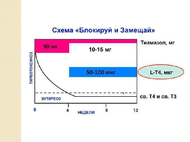 Заместительная терапия Вся послеоперационная терапия сводится к приему L-тироксина сразу на следующий день после операции. Доза рассчитывается исходя из веса 1, 6 мкг/кг. Адекватной дозе тироксина соответствует нормальный уровень ТТГ