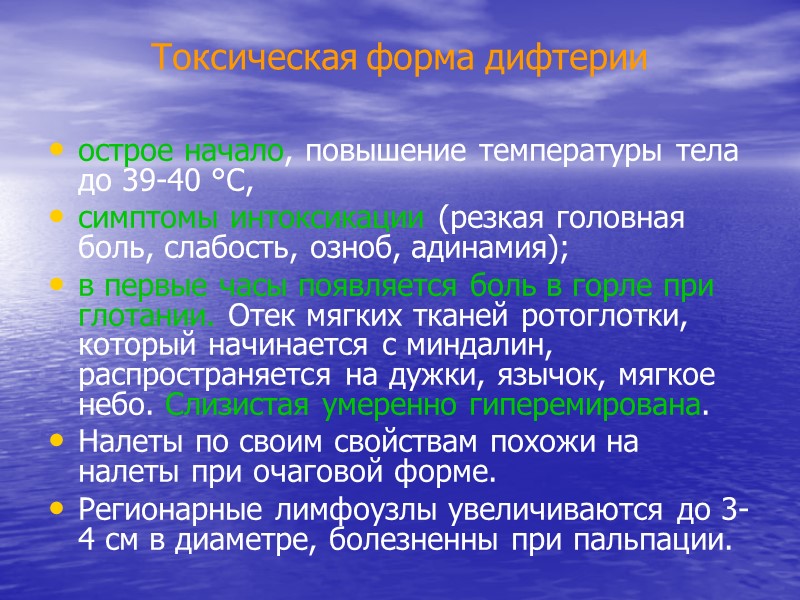 Токсическая форма дифтерии острое начало, повышение температуры тела до 39-40 °С, симптомы интоксикации (резкая головная боль, слабость, озноб, адинамия); в первые часы появляется боль в горле при глотании. Отек мягких тканей ротоглотки, который начинается с миндалин, распространяется на дужки, язычок, мягкое небо. Слизистая умеренно гиперемирована. Налеты по своим свойствам похожи на налеты при очаговой форме. Регионарные лимфоузлы увеличиваются до 3-4 см в диаметре, болезненны при пальпации.