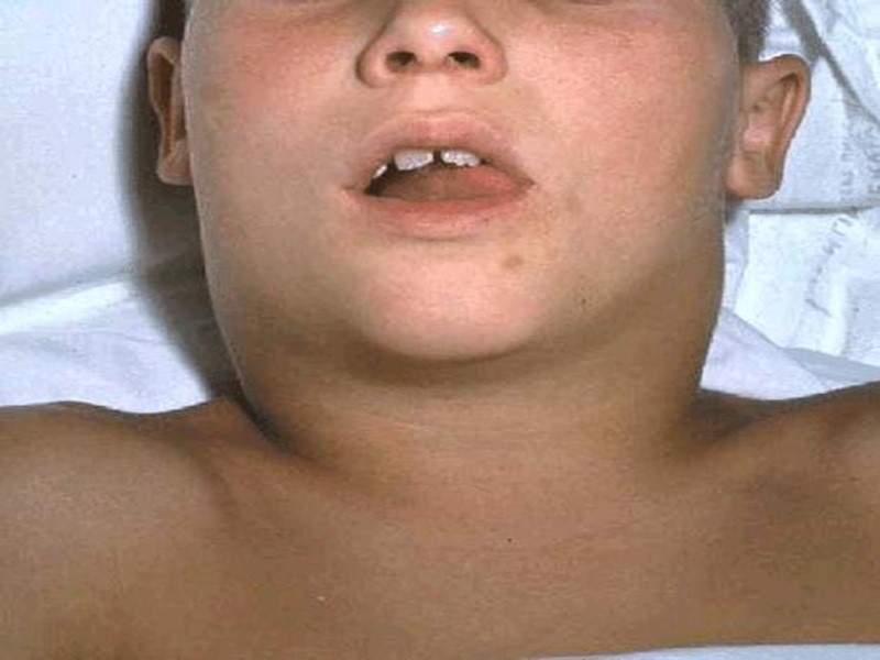 При субтоксической форме отек односторонний и только в области углочелюстных лимфоузлов. При токсической дифтерии I степени отек доходит до середины шеи, при II степени - до ключицы, при III степени - ниже ключицы. Надавливание в области отека безболезненно и не оставляет следа. Может наблюдаться болевой тризм. Часто изо рта больных токсической дифтерией II-III степени ощущается приторно-сладковатый запах. Язык обложен, сухой, на губах трещины.