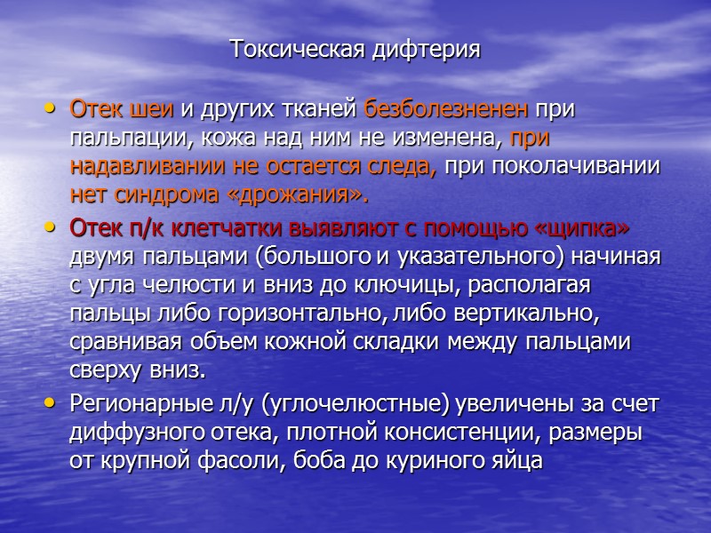 Токсическая дифтерия Отек шеи и других тканей безболезненен при пальпации, кожа над ним не изменена, при надавливании не остается следа, при поколачивании нет синдрома «дрожания». Отек п/к клетчатки выявляют с помощью «щипка» двумя пальцами (большого и указательного) начиная с угла челюсти и вниз до ключицы, располагая пальцы либо горизонтально, либо вертикально, сравнивая объем кожной складки между пальцами сверху вниз. Регионарные л/у (углочелюстные) увеличены за счет диффузного отека, плотной консистенции, размеры от крупной фасоли, боба до куриного яйца