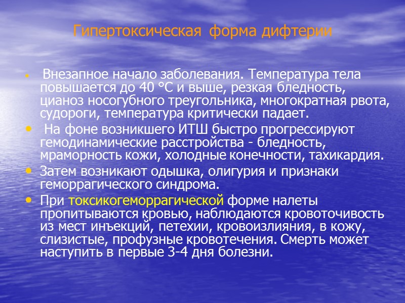 Гипертоксическая форма дифтерии Внезапное начало заболевания. Температура тела повышается до 40 °С и выше, резкая бледность, цианоз носогубного треугольника, многократная рвота, судороги, температура критически падает. На фоне возникшего ИТШ быстро прогрессируют гемодинамические расстройства - бледность, мраморность кожи, холодные конечности, тахикардия. Затем возникают одышка, олигурия и признаки геморрагического синдрома. При токсикогеморрагической форме налеты пропитываются кровью, наблюдаются кровоточивость из мест инъекций, петехии, кровоизлияния, в кожу, слизистые, профузные кровотечения. Смерть может наступить в первые 3-4 дня болезни.