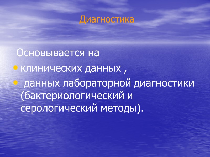 Диагностика Основывается на клинических данных , данных лабораторной диагностики (бактериологический и серологический методы).