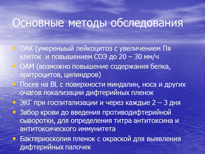 Основные методы обследования ОАК (умереныый лейкоцитоз с увеличением Пя клеток и повышением СОЭ до 20 – 30 мм/ч ОАМ (возможно повышение содержания белка, эритроцитов, цилиндров) Посев на BL с поверхности миндалин, носа и других очагов локализации дифтерийных пленок ЭКГ при госпитализации и через каждые 2 – 3 дня Забор крови до введения противодифтерийной сыворотки, для определения титра антитоксина и антитоксического иммунитета Бактериоскопия пленок с окраской для выявления дифтерийных палочек
