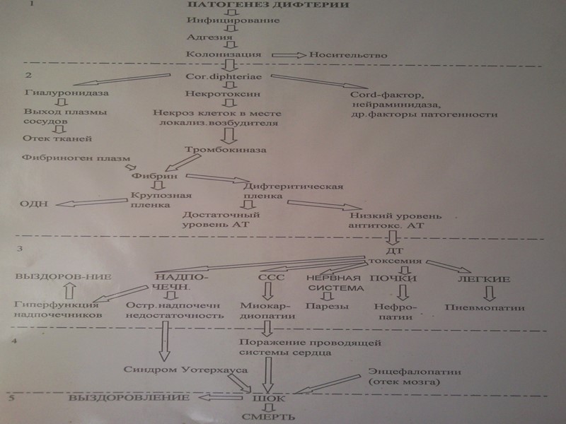 Дифтерийные микробы остаются в месте входных ворот. В ответ на воздействие дифтерийного токсина вырабатываются антитоксины. Эта иммунная реакция в комплексе с другими защитными механизмами обеспечивает уменьшение интоксикации и клинических проявлений заболевания, приводит к развитию антитоксического иммунитета.