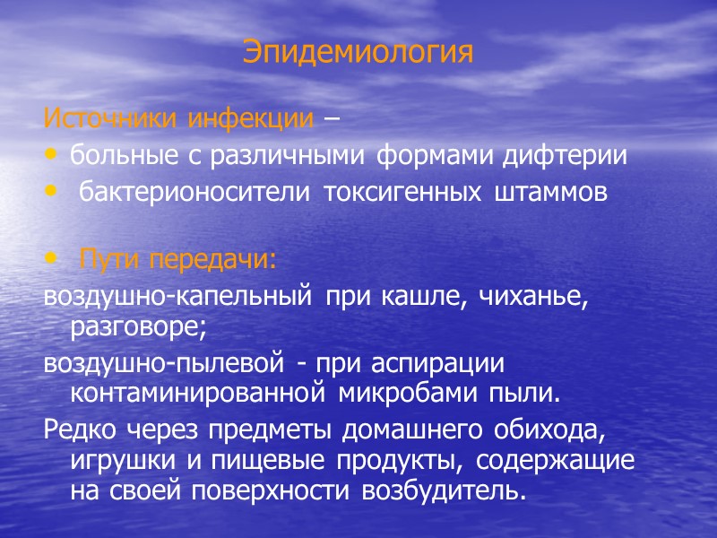 Эпидемиология Источники инфекции – больные с различными формами дифтерии бактерионосители токсигенных штаммов Пути передачи: воздушно-капельный при кашле, чиханье, разговоре; воздушно-пылевой - при аспирации контаминированной микробами пыли. Редко через предметы домашнего обихода, игрушки и пищевые продукты, содержащие на своей поверхности возбудитель.
