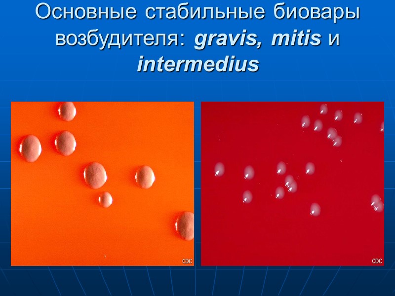 Основные стабильные биовары возбудителя: gravis, mitis и intermedius