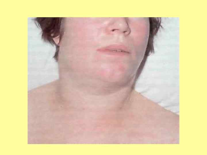 3. Токсическая форма дифтерии зева Бурное начало - фебрильная лихорадка, выраженная слабость, боли в горле, в шее. В зеве – выраженный отек (миндалины соприкасаются). Со 2 -го дня болезни – налеты грязно-серого цвета, толстые, покрывают миндалины, мягкое и твердое небо. Изо рта – сладковатый запах. Увеличение всех шейных лимфоузлов (до величины куриного яйца). Появляется отек шейной клетчатки: При токсической дифтерии 1 степени – отек шейной клетчатки до середины шеи При 2 степени – отек до ключицы При 3 степени – отек ниже ключицы.