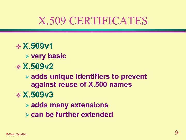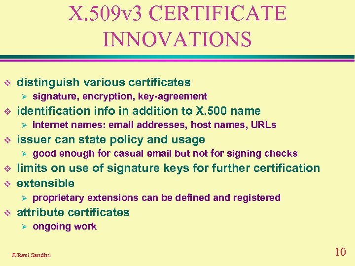 X. 509 CERTIFICATES v X. 509 v 1 Ø very basic v X. 509 v 2 Ø adds unique identifiers to prevent against reuse of X. 500 names v X. 509 v 3 Ø adds many extensions Ø can be further extended © Ravi Sandhu 9