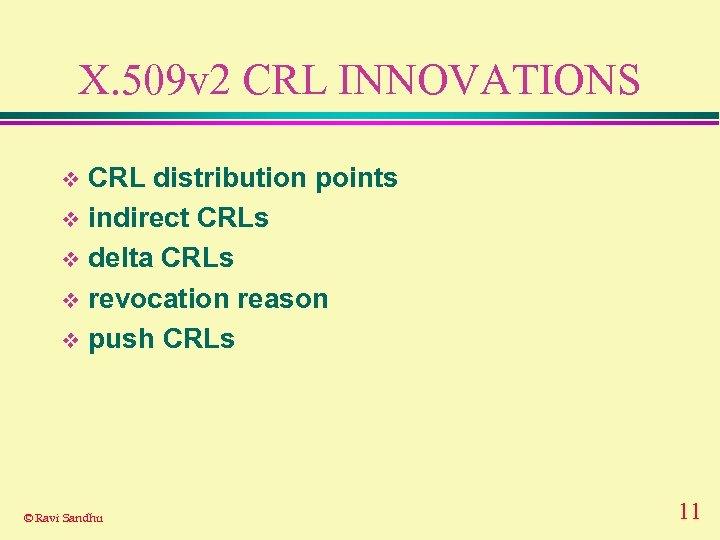 X. 509 v 3 CERTIFICATE INNOVATIONS v distinguish various certificates Ø v identification info in addition to X. 500 name Ø v v good enough for casual email but not for signing checks limits on use of signature keys for further certification extensible Ø v internet names: email addresses, host names, URLs issuer can state policy and usage Ø v signature, encryption, key-agreement proprietary extensions can be defined and registered attribute certificates Ø ongoing work © Ravi Sandhu 10