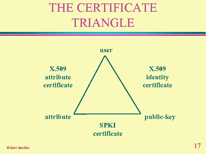 THE CERTIFICATE TRIANGLE user X. 509 attribute certificate X. 509 identity certificate attribute public-key SPKI certificate © Ravi Sandhu 17