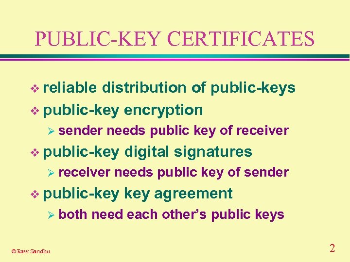 PUBLIC-KEY CERTIFICATES v reliable distribution of public-keys v public-key encryption Ø sender needs public key of receiver v public-key Ø receiver needs public key of sender v public-key Ø both © Ravi Sandhu digital signatures key agreement need each other’s public keys 2