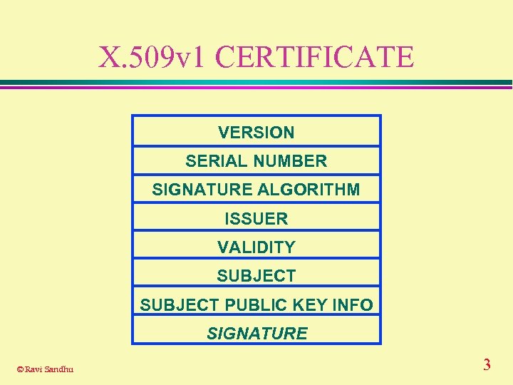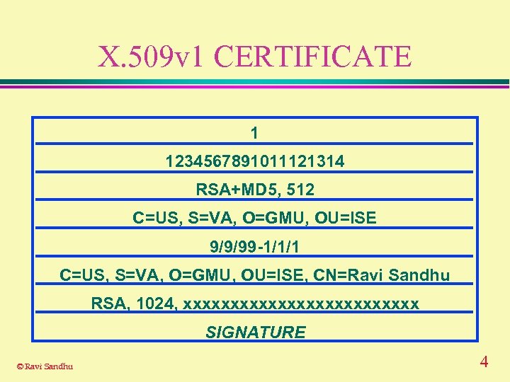 X. 509 v 1 CERTIFICATE VERSION SERIAL NUMBER SIGNATURE ALGORITHM ISSUER VALIDITY SUBJECT PUBLIC KEY INFO SIGNATURE © Ravi Sandhu 3