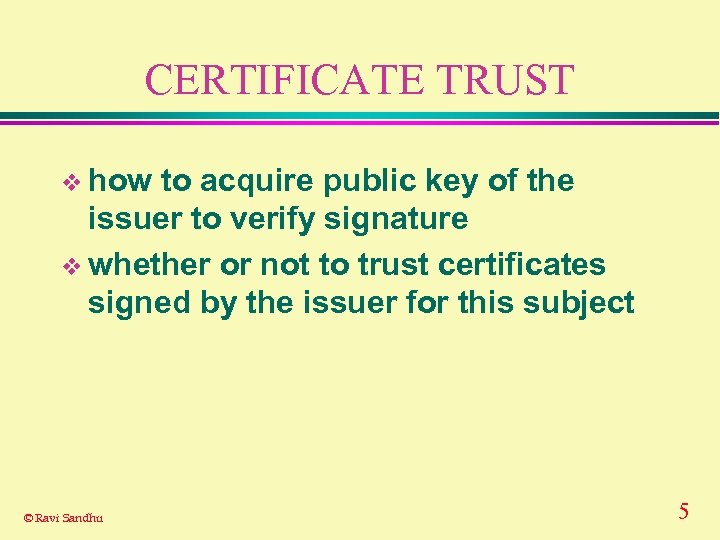CERTIFICATE TRUST v how to acquire public key of the issuer to verify signature v whether or not to trust certificates signed by the issuer for this subject © Ravi Sandhu 5
