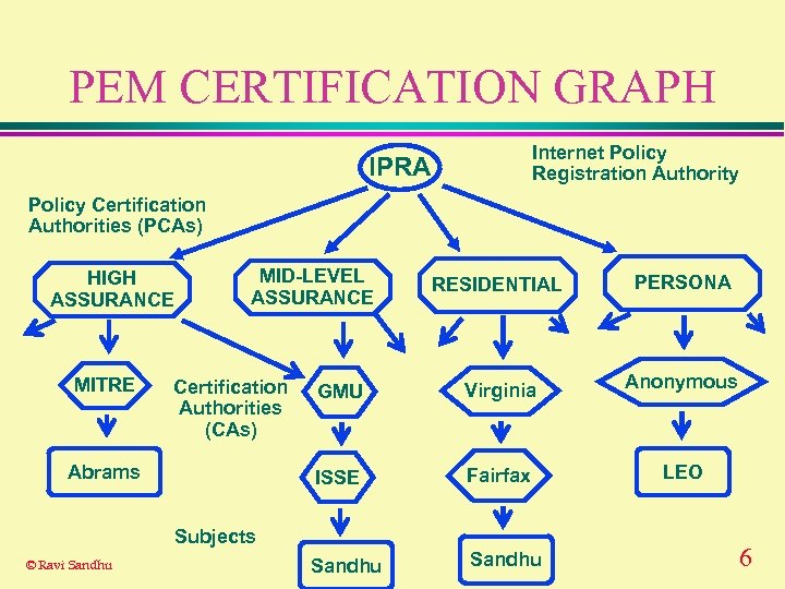 PEM CERTIFICATION GRAPH Internet Policy Registration Authority IPRA Policy Certification Authorities (PCAs) HIGH ASSURANCE MITRE MID-LEVEL ASSURANCE Abrams PERSONA GMU Virginia Anonymous ISSE Certification Authorities (CAs) RESIDENTIAL Fairfax LEO Sandhu Subjects © Ravi Sandhu 6