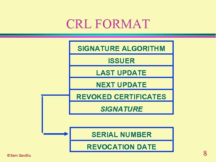 CRL FORMAT SIGNATURE ALGORITHM ISSUER LAST UPDATE NEXT UPDATE REVOKED CERTIFICATES SIGNATURE SERIAL NUMBER REVOCATION DATE © Ravi Sandhu 8