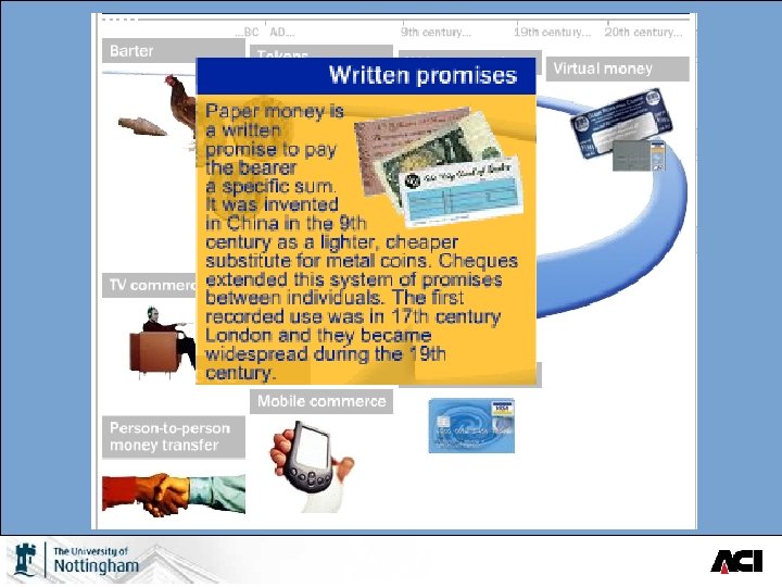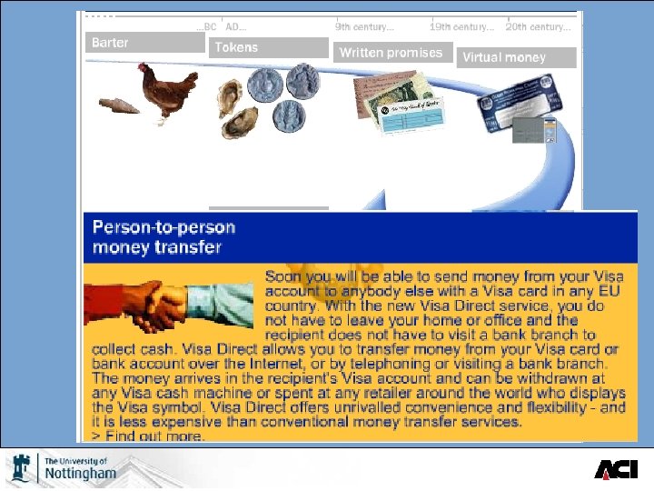 Different types of Payment/Settlement Operation UK • CHAPS – High Value Payments, Immediate Transfer of Value – Real-Time Gross Settlement between parties • BACS – Bulk low-value Clearing Transactions – Direct Debit, Standing Order, Credit Transfer – 3 -day clearing cycle • Cheque – Bulk lower-value method • LINK – ATM withdrawal – end of day settlement • VISA, Master. Card, Maestro – Higher value merchants (too expensive for corner shops) – Credit and Debit Card Offerings – Usually end of day settlement
