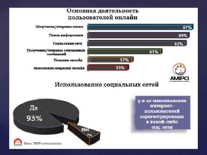 Интернет-пользователи В среднем каждый мексиканец проводит в сети около 5 часов и 2 минут. Чаще всего подключение к Интернету происходит дома (84%) или на месте работы (42%). Наиболее распространенным средством, используемым для подключения к сети, по-прежнему остаются ПК и ноутбук (59 и 57% соответственно), но, возможно, вскоре они уступят место смартфонам, которыми для подключения уже пользуются уже 49% пользователей. Через сотовые телефоны подключаются 27%, а через IPod и игровые консоли всего лишь 18%.