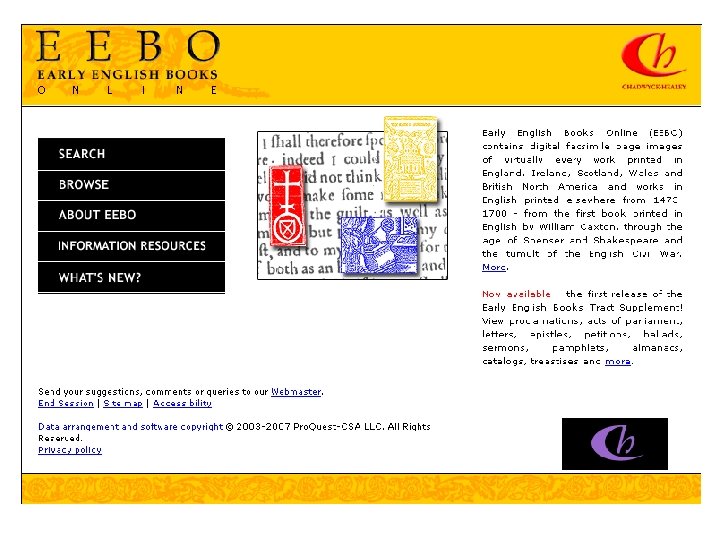 Early English Books Online Content: • Images of virtually every book, periodical and pamphlet printed in Britain and America, and books in English printed in other countries, from 1473 to 1700 • 33 languages, from Algonquin to Welsh • 200 contributing libraries • More than 100, 000 books