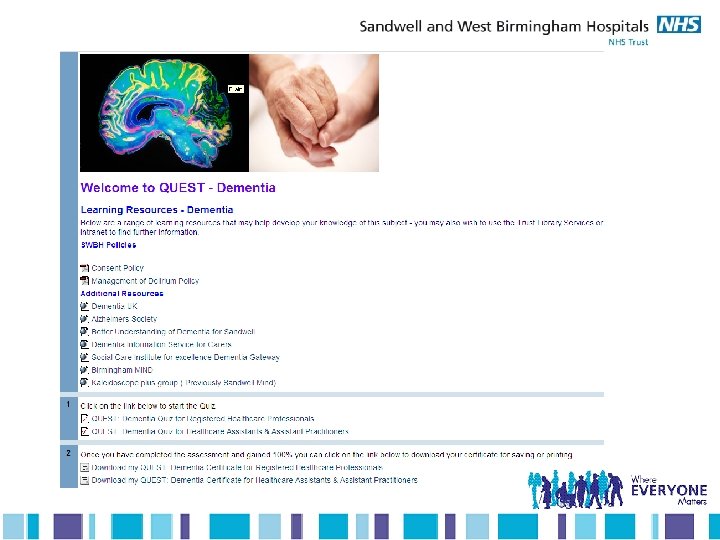 “The scenarios made you stop and think and not take patient care for granted” “QUEST suited my learning style” “The scenarios helped me identify weaknesses and training sessions I may need to update my knowledge. ” “ Made me realise how important our job is and our responsibility to patients and relatives” What dignity means to me. . “It really makes you think about your approach. I learned from everyone around me”. “E-learning is a good way of learning for me; it meant I could work at my own pace” “Much more enjoyable than Power. Point all day”