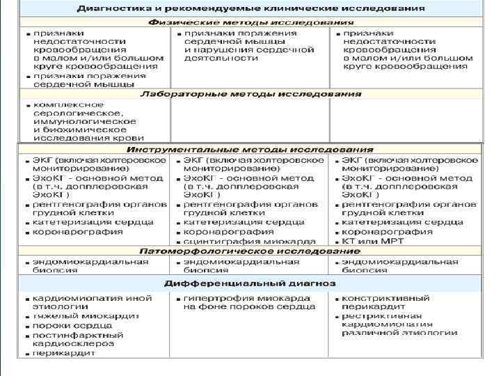 ДИФФЕРЕНЦИАЛЬНЫЙ ДИАГНОЗ Дифференциальная диагностика идиопатической дилатационной кардиомиопатии (ДКМП) проводится со следующими заболеваниями: ишемическая кардиомиопатия; тяжелый миокардит ( в том числе миокардит Фидлера); поражение миокарда при диффузных заболеваниях соединительной ткани (в основном при системной склеродермии и системной красной волчанке); ревматические митральные пороки сердца; неревматическая митральная недостаточность; стеноз устья аорты. Клинические проявления ДКМП также имеют определенные сходства с такими более редкими патологиями, как экссудативный перикардит, поражение сердца при амилоидозе, гемохроматозе и саркоидозе, некоторые другие кардиомиопатии.