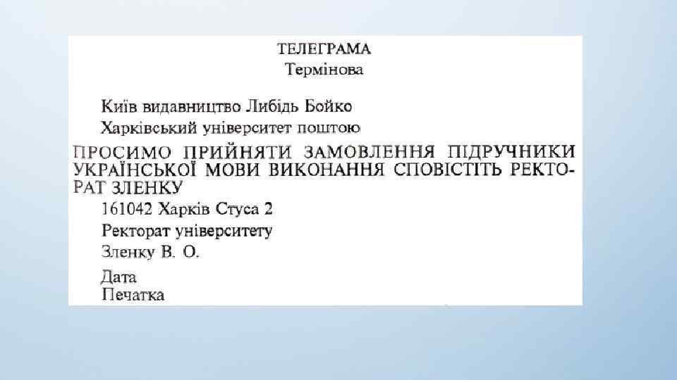 Телегра ма (від грец. τηλέ — далеко і γραμμα — буква, запис) — повідомлення, послане телеграфом, одним з перших видів зв'язку, що використовує електричну передачу інформації. Телеграми передаються, як правило, з використанням азбуки Морзе. Телеграми друкують на паперовій стрічці, яку потім наклеюють на лист паперу з метою зручності читання. Залежно від призначення службові телеграми бувають внутрішні і зовнішні. Внутрішні службові телеграми поділяються на • вищі державні • термінові • звичайні.
