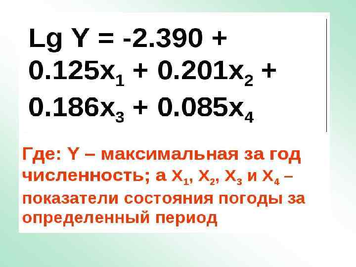 • Х 1 – сумма эффективных температур с начала прорастания семян однолетников до 31 авг (конец зимы южн. полушария); Х 2 – суммарное количество осадков в сентябре-октябре (весна южн. полушария); Х 3 – средняя эффективная температура в сентябре-октябре; Х 4 – значение Х 3 в предыдущий год. • Модель объясняла 78% дисперсии максимальной достигнутой за год численности
