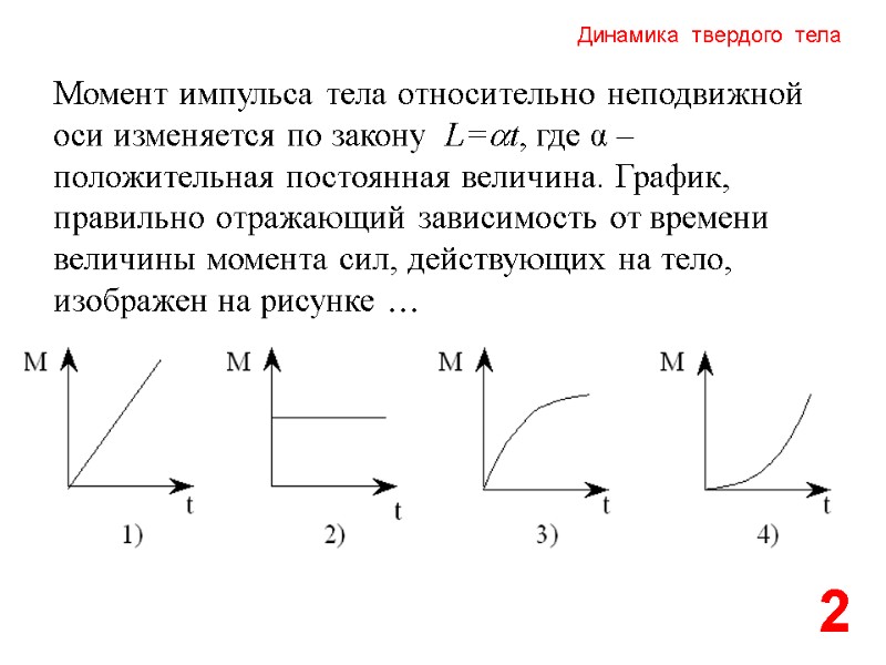 Динамика твердого тела 1 Момент импульса тела относительно неподвижной оси изменяется по закону L=at2, где α – положительная постоянная величина. График, правильно отражающий зависимость от времени величины момента сил, действующих на тело, изображен на рисунке