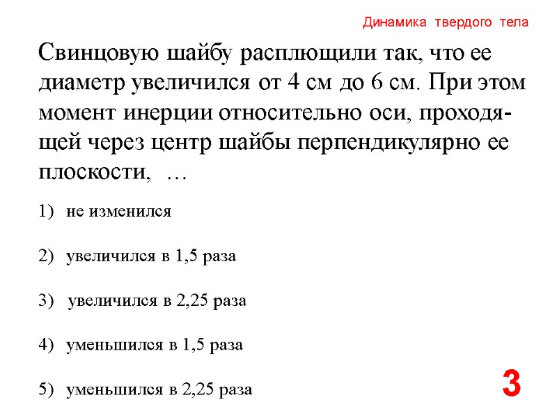 Динамика твердого тела Свинцовую шайбу расплющили так, что ее диаметр увеличился от 4 см до 6 см. При этом момент инерции относительно оси, проходя-щей через центр шайбы перпендикулярно ее плоскости, … не изменился увеличился в 1,5 раза 3) увеличился в 2,25 раза уменьшился в 1,5 раза уменьшился в 2,25 раза 3